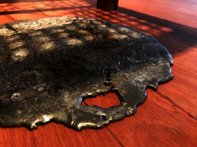 下には、壊れた椅子の座面の下に鉛が垂れ落ちている。
