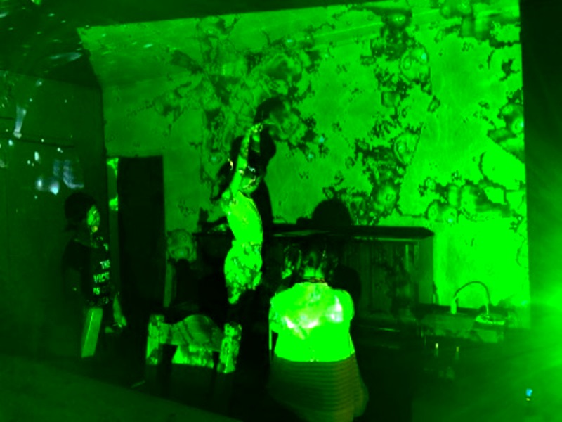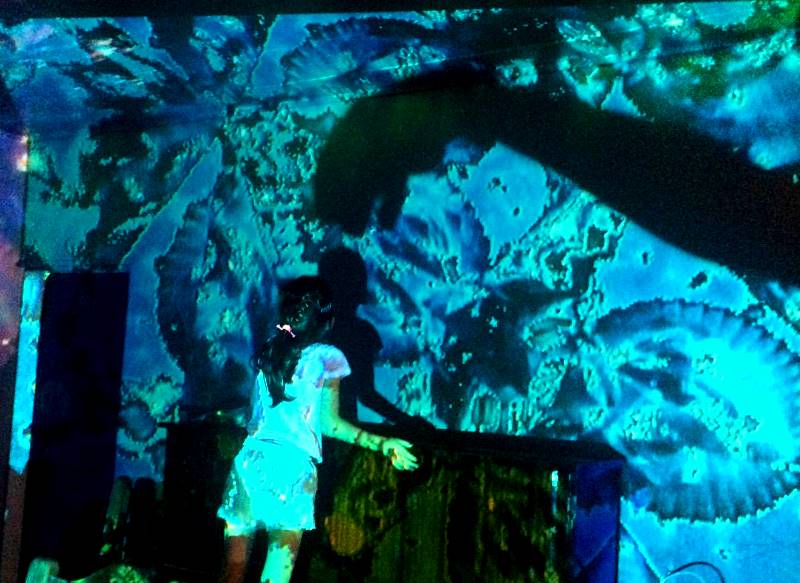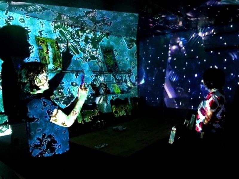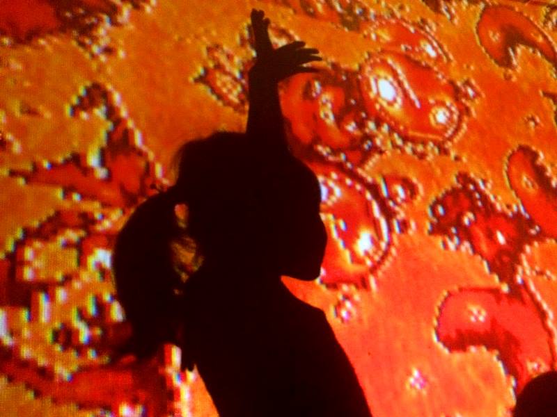 映像の空間では、子どもと一緒に影絵で遊んだり