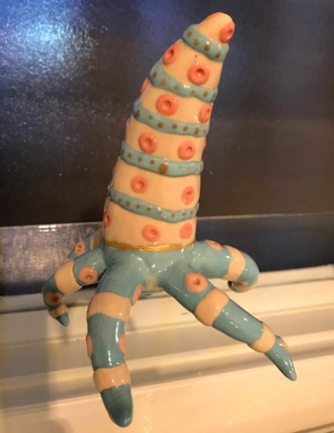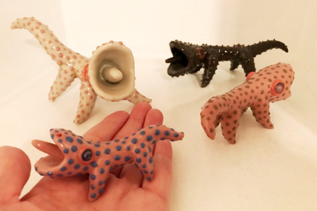2017.10.08galeria-puntoblog 2017 What Dottokage? ASADAさんのドットカゲ、ご存知の方も多いのではないでしょうか。 Puntoでも人気の手のひらサイズのドットカゲ、 今展では、なんとSサイズ・SSサイズもお目見えしました!! 是非見に来てください。 他にも、ヒトデをはじめとする海の生き物と思われる生物がいろいろ。 こちらは初お目見え。 フジツボと骨(bone)を組合わせた新種、不実bone。 debacle or sublimation オーガンジー galeria-punto