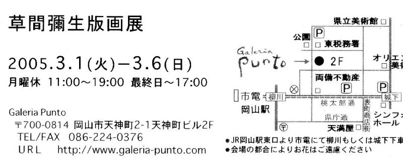 2005.03.01galeria-puntoExhibition 20050 comments 大安 聖 「Live Document再現 PEACE&LOVE」 ミツル・カメリアーノ galeria-punto Leave a comment コメントをキャンセルメールアドレスが公開されることはありません。 * が付いている欄は必須項目です Δ