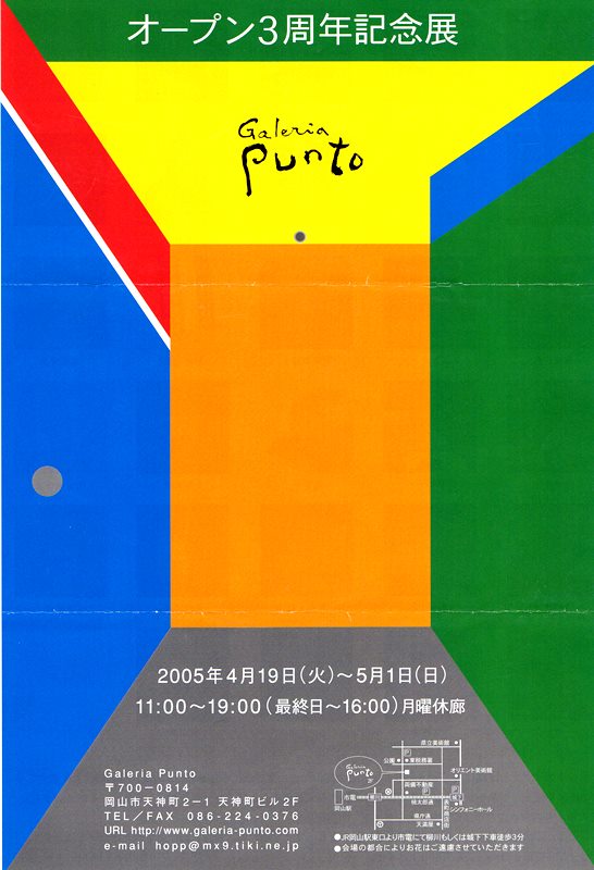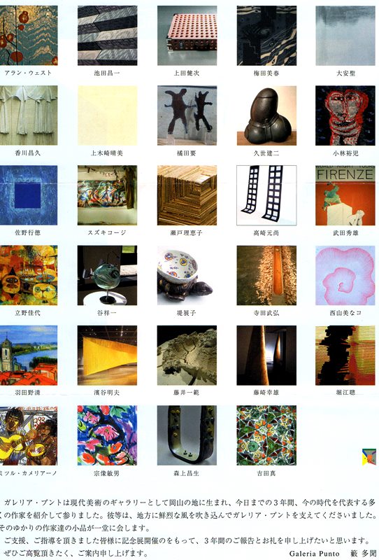 2005.04.19galeria-puntoExhibition 20050 comments 19 April – 1 May 2005 ガレリア・プントは現代美術のギャラリーとして岡山の地に生まれ、 今日までの3年間、今の時代を代表する多くの作家を紹介して参りました。 彼らは、地方に鮮烈な風を吹き込んでガレリア・プントを支えてくださいました。 そのゆかりの作家達の小品が一堂に会します。 ご支援、ご指導を頂きました皆様に記念開催をもって、 3年間のご報告とお礼を申し上げたいと思います。 ぜひご高覧頂きたく、ご案内申し上げます。 Galeria Punto 籔 多聞 「FUTON」 神崎佐知子 「天国の地獄 地獄の天国」 三木俊治 galeria-punto Leave a comment コメントをキャンセルメールアドレスが公開されることはありません。 * が付いている欄は必須項目です Δ