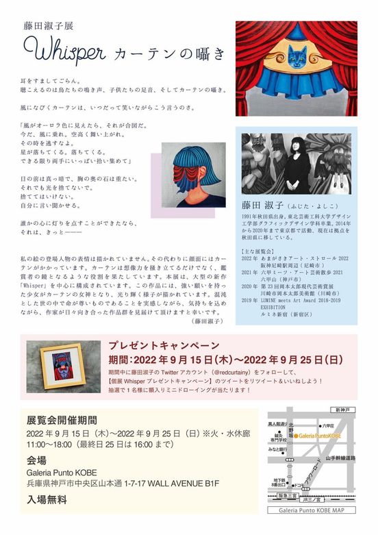 2022.08.06galeria-punto未分類0 comments 「Whisper~カーテンの囁き~」藤田淑子 2022年9月15日(木)~9月25日(日)神戸 火・水曜 休廊 11:00~18:00(最終日~16:00) 「ゆめひよりにほひ」佐野弘翔 「ギャラリーに佇む歌Ⅲ/Ⅳ」スーマー galeria-punto Leave a comment コメントをキャンセルメールアドレスが公開されることはありません。 * が付いている欄は必須項目です Δ