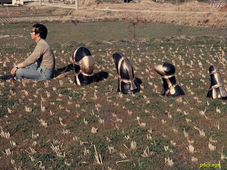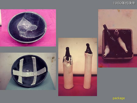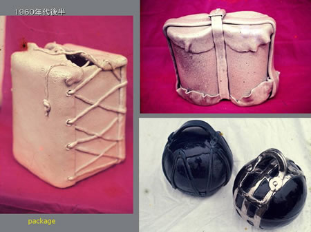 大学を出てからは愛知の瀬戸で仕事につき、高校の教師をしていました。その後、70年代の初頭になって東京の有楽町で最初の個展を開きました。色々なものを縛って、包み方のバリエーションを何でも作品にしていました。金彩をほどこした作品は高さが50センチくらいのものですが、この金彩はラーメン鉢に描いてある龍などに使っているものと同じで、素焼きと本焼きの後に800度くらいで焼き付けます。