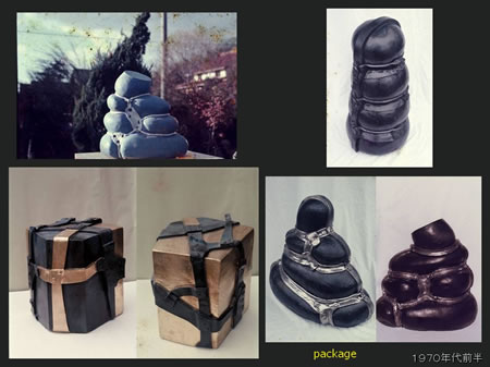 左と右上の白い作品は40センチくらいの大きさで、右下の作品はバスケットボールから形をとったものです。どれも包んで縛ったかたちになっていて、「パッケージ」シリーズとしてオブジェをつくりはじめました。