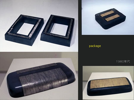 パッケージシリーズの後半、80年代の作品です。下の作品は横幅が1メートルにもなる大きなもので、短冊上の金や銀をはめこんだもので、京都の近代美術館にコレクションされています。