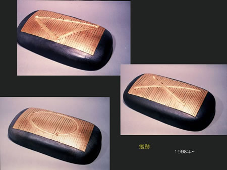これはパッケージと痕跡が一緒になった作品です。表面にある○、×、△は、指先でひっかいたもの。土の動きが瞬間的に出て、生々しさがよく出る、訴求力が強くなっています。