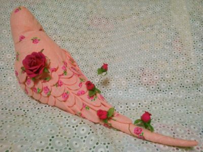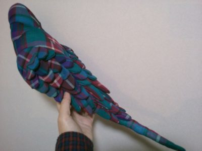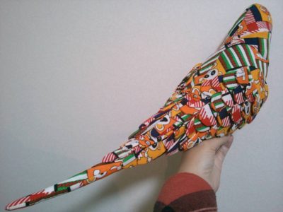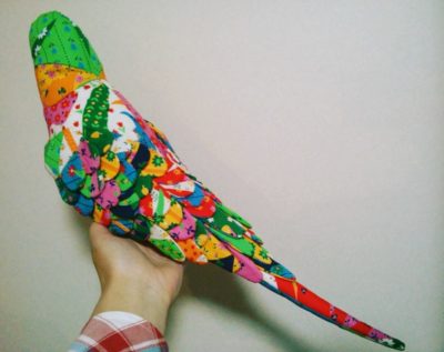 川上さんは、子ども時代のワンピースやカーテンなどの生地を使ってメモリーインコも制作している。