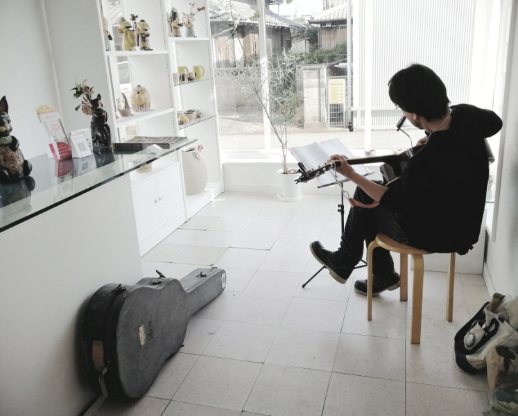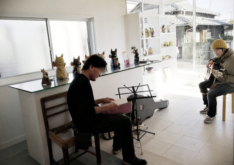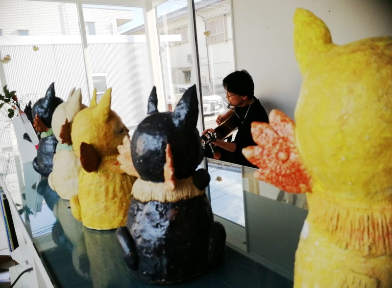 吾遇の招き猫を観客に、シンゴさんのひとりギター。