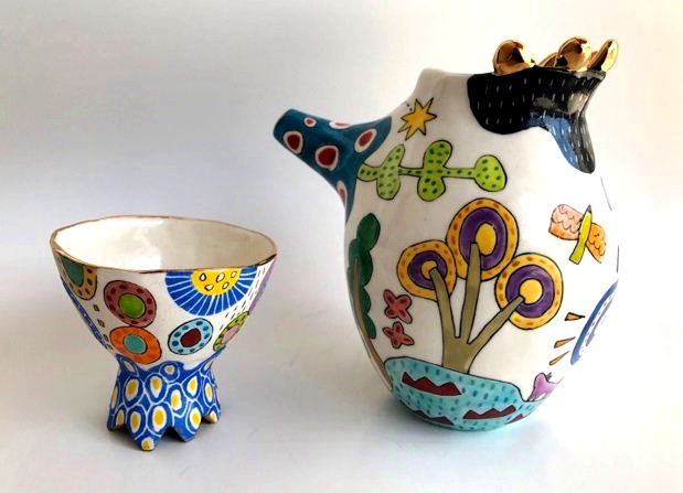 「まるまるフラワーぐい呑み」と、注器「モリノナカ」。