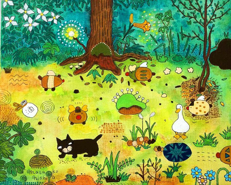 西尾昌子さんの作品に出てくる丸の中に星のような形が見える池らしきものは