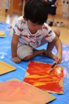 ダンボールに絵の具を乗せて、好きなようにやらせた作品です。