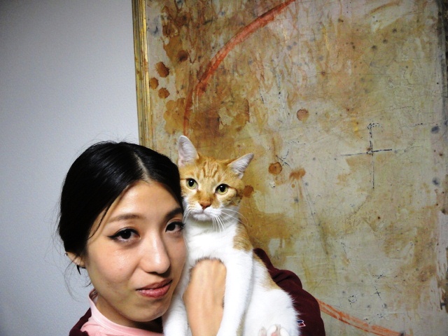 絵画は空間芸術で、音楽は時間芸術だという定義があるけれど、彼女の作品は、絵画でありながら時間芸術ともいえそうなのだ。1ピースずつ完成するより、彼女の表現は音楽のようにずっと続いていて、たまたまそこに紙と筆があれば、腕の先から物理的な形になって抽出される。だから、彼女が書き溜めた夥しいドローイングの紙片に埋もれてみて初めて、何となくその全体像がつかめるのだろうと想像する。(それを体験しているのは、彼女の愛猫だけだ)