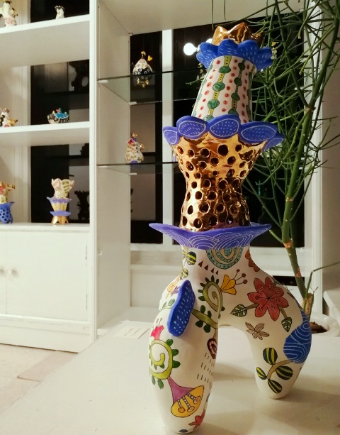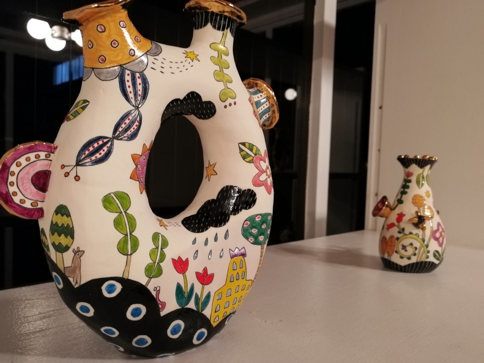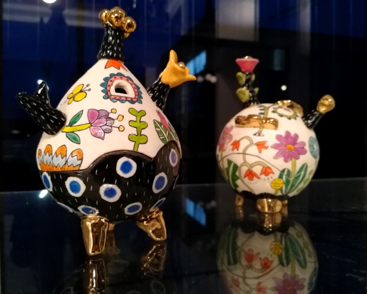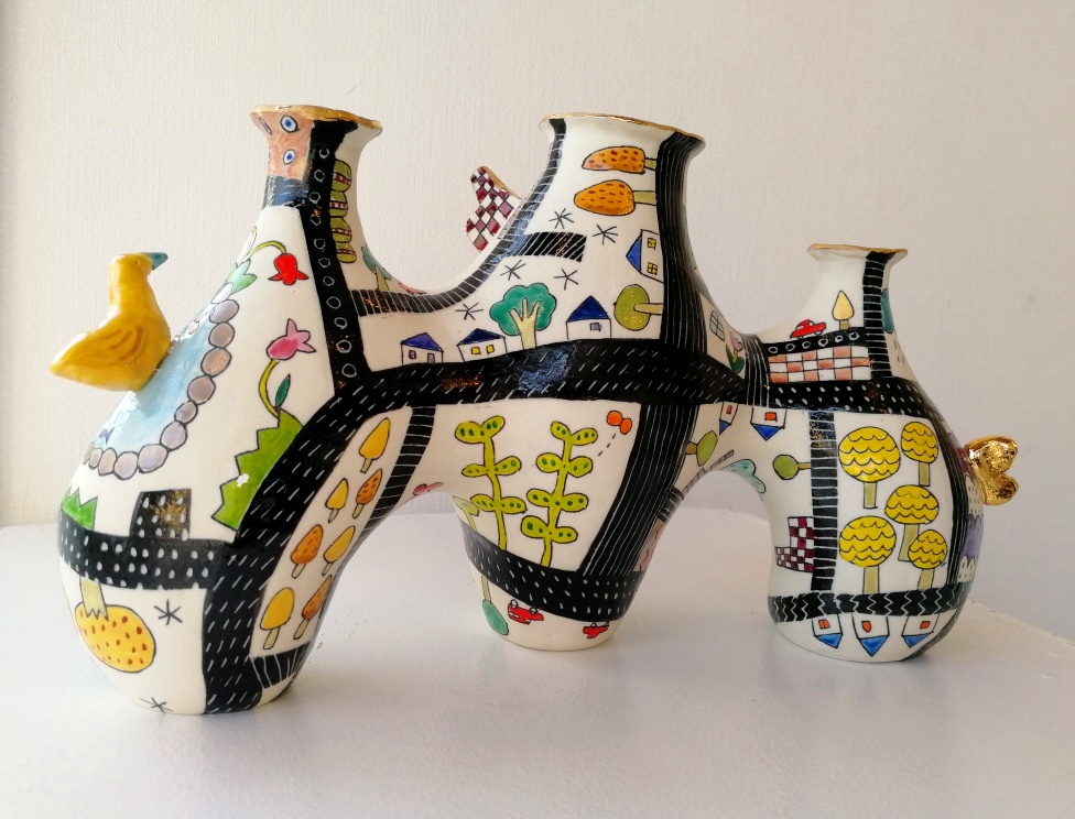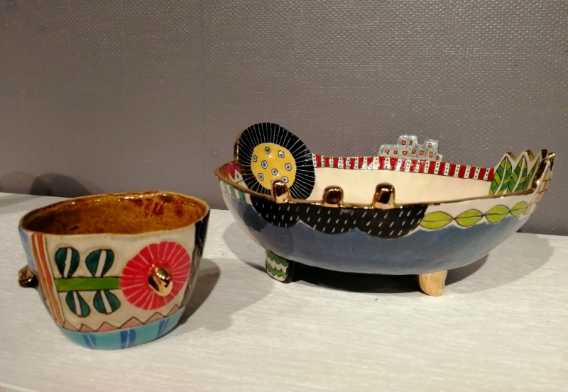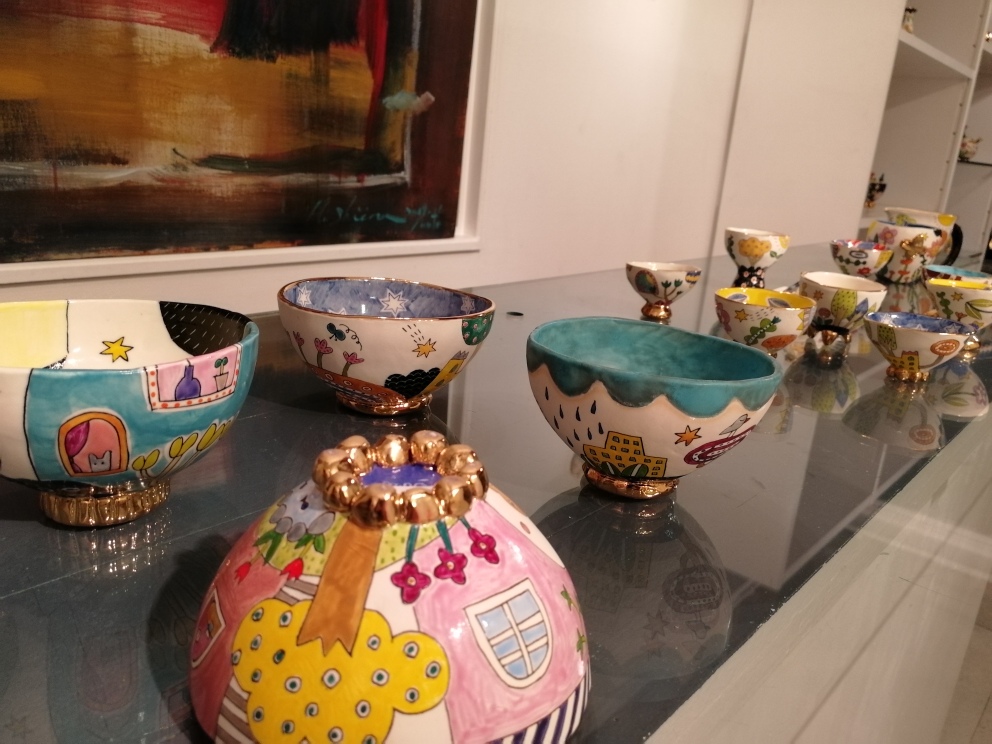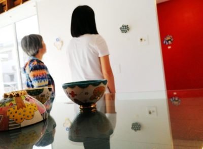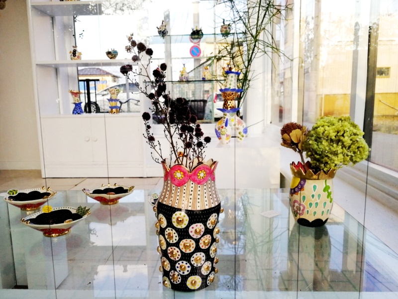 初めて山下さんの作品を見た時は、半磁器の肌に隙間なく埋め尽くされた色とりどりの絵付けに