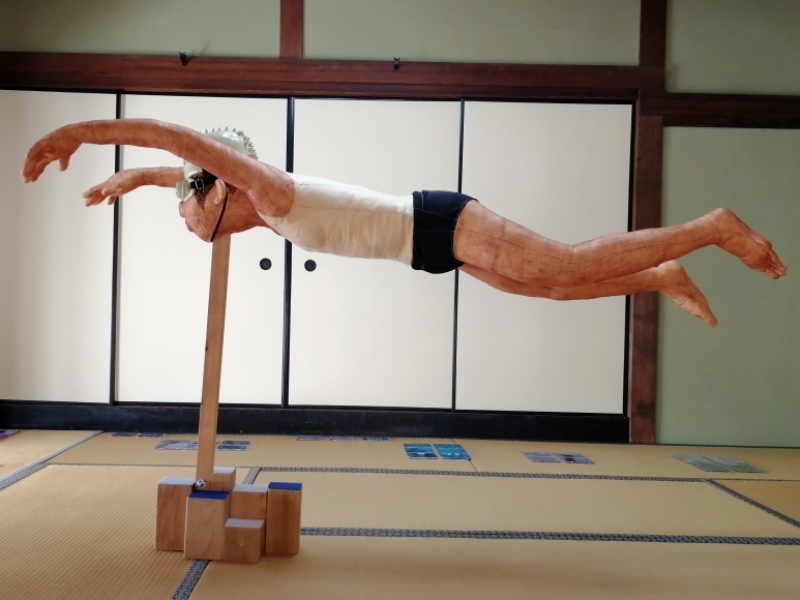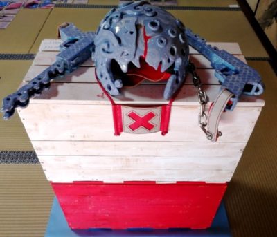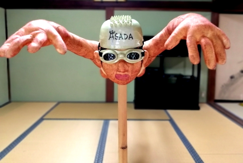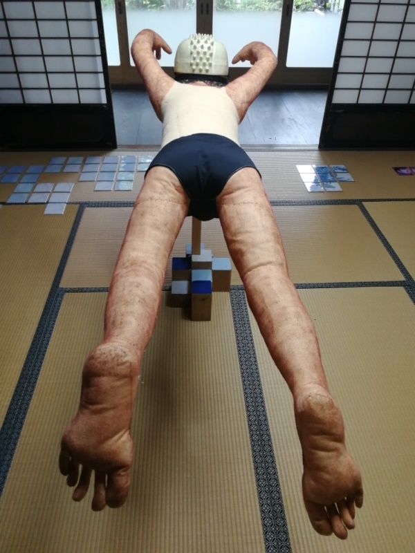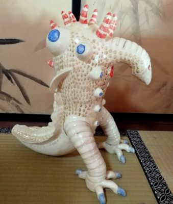 こちらの陶製の作品を身に着けているのが、作家本人。