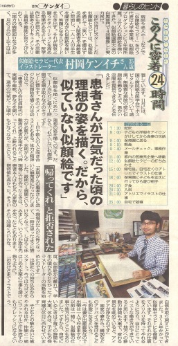 2017.12.20galeria-puntoblog 2017 12月24日クリスマスイブの夜中の1時30分から 日本テレビの「NNNドキュメント」で 村岡ケンイチさんの似顔絵セラピーが放送されます。 再放送はBSで大晦日31日のお昼11時になります。 「NNNドキュメント」は1970年1月4日にスタートしたドキュメンタリー番組で 「3分クッキング」「笑点」に続く、日本テレビでは3番目の長寿番組です。 NNNとは、NipponNewsNetwork(ニッポンニュースネットワーク)の略で 番組の制作には日本テレビをはじめ民放ニュースネットワーク29社が参加しています。 北海道から沖縄まで様々な出来事を取材し、時には海外にも目を向けてきました。 人々の日々の喜怒哀楽を見つめ、 生きる力となる”希望”や”絆”を描いてきました。 何かに思い悩み、それを乗り越える瞬間に、カメラは寄り添ってきました。 こうした番組作りが評価され、 「文化庁芸術祭大賞」「日本民間放送連盟賞最優秀」 「日本放送文化大賞」「放送文化基金賞本賞」、 日本のTV番組としては初の受賞となった「国際エミー賞」を獲得しています。 番組はこれからも、時代を記録しつづけます。 そしてきょうより明日、明日より未来へ、すこしでも笑顔が増えていきますように 日曜日の深夜、視聴者の皆さまとともに考えていきたいと思っています。 (日テレ公式チャンネルより) また、日刊ゲンダイに全国の医療施設で行っている ケンイチさんの似顔絵セラピーの活動が取り上げられました。 今まで行ってきた活動の経験談や仕事の仕方などが掲載されています。 日刊ゲンダイデジタル(20日に掲載) https://www.nikkan-gendai.com/ Christmas story のつづき クリスマスイブ2017 galeria-punto
