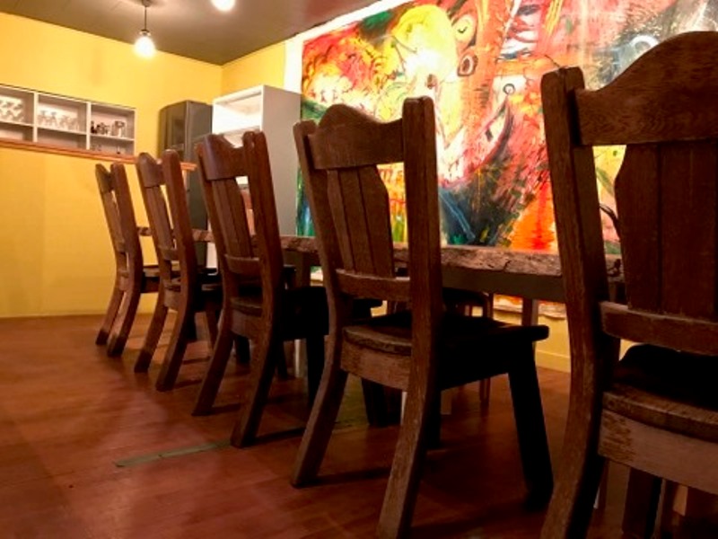 カフェスペースは作品のジャマにならないよう展示スペースの奥、ワークスペースの横に設置しております。
